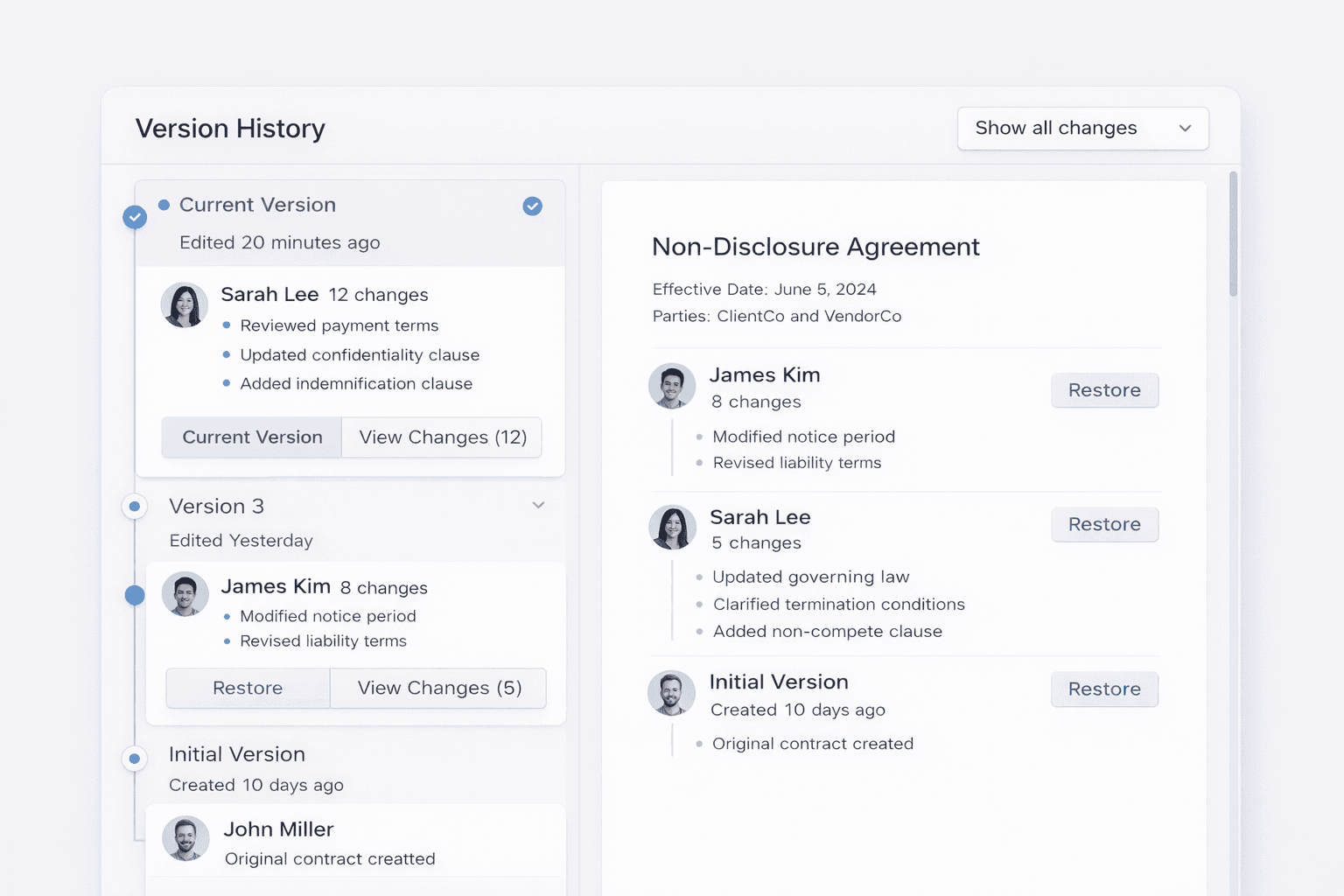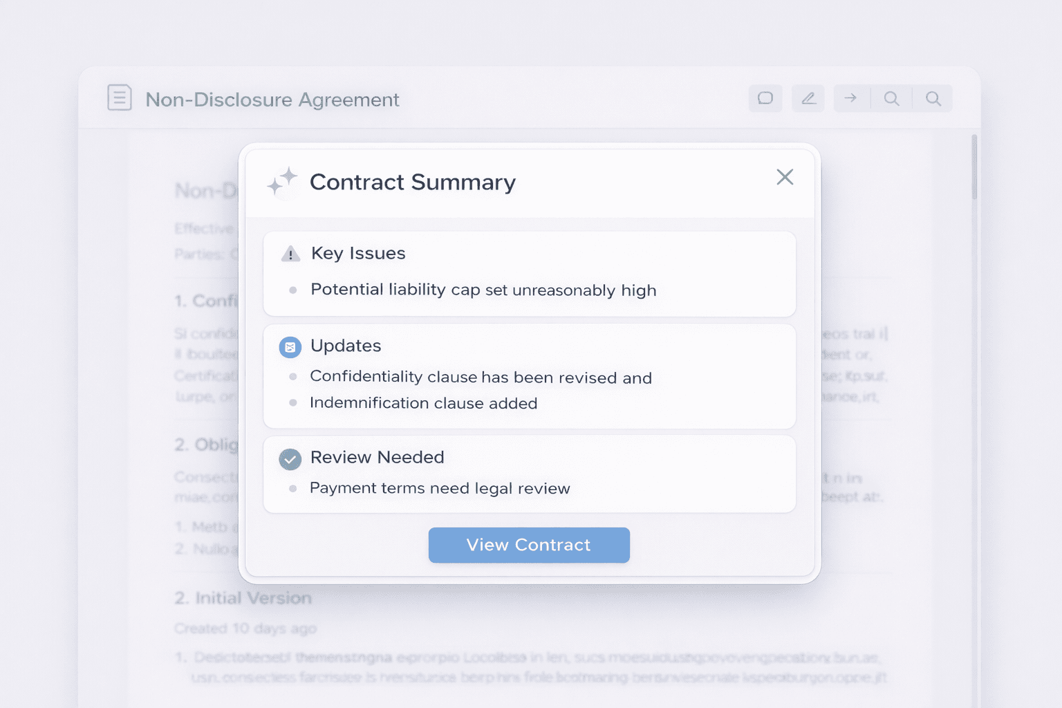 Go beyond redlines. Doc Comparator analyzes revisions across multiple documents, explains their legal impact, and lets you reason through changes with contextual Q&A.